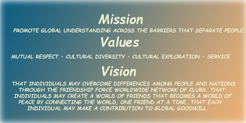Friendship Force, an international travel and cultural exchange club, provides you opportunities to meet people across the world on a personal basis. Members of over 360 Friendship Force chapters in 70 countries visit one another staying in each other's homes sharing meals, conversation and experiences for one week. The host chapter arranges activities for the visiting chapter but it's more about faces than places. Experience Different Views. Discover Common Ground.